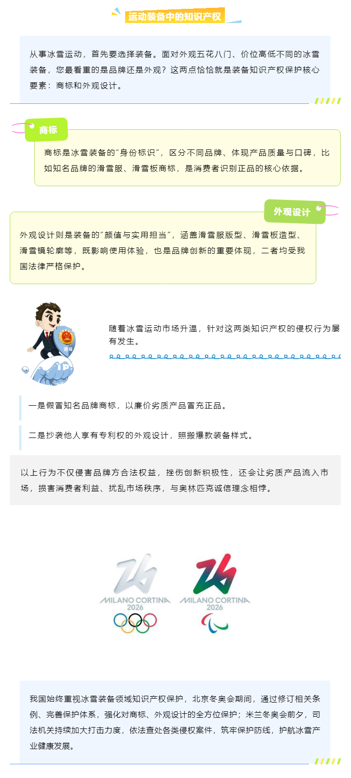 长期以来,体育运动的大众化、专业化、商业化,特别是大型赛事的组织、推广与转播,都离不开知识产权的保驾护航。2022年北京冬奥会推动我国冰雪运动蓬勃发展,也对冰雪领域知识产权保护工作提出了更高要求。2026年米兰-科尔蒂纳冬奥会已开幕,而世界知识产权日的主题正是“知识产权和体育:各就位、预备、创新!”。从北京到米兰,奥林匹克精神薪火相传;从专项打击到长效守护,知识产权保护步履不停。让我们一起跟随江苏省南通通州湾检察“湾知仔”,感受冰雪魅力,构筑知产防线。
