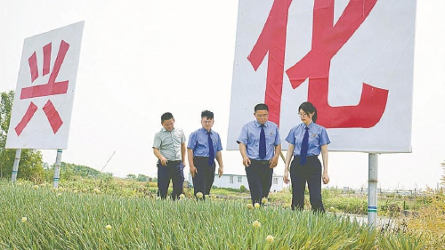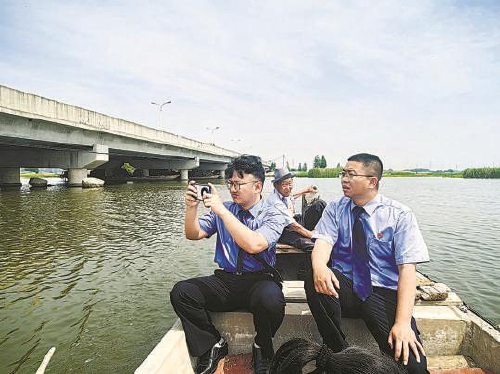 江苏兴化垛田是全球重要农业文化遗产和世界灌溉工程遗产。芒种时节,江苏省兴化市熟女探花 公益诉讼办案团队前往辖区杨荡村垛田保护核心区进行巡查,了解检察建议落实情况。检察人员行走在垛上,查看特产“兴化香葱”长势,向村干部了解种植户涉法诉求(上图);乘船巡河,查看垛田保护区水环境及河道安全情况(下图)。公益诉讼检察职能筑起一道法治屏障,温情守护着“梦里水乡”。