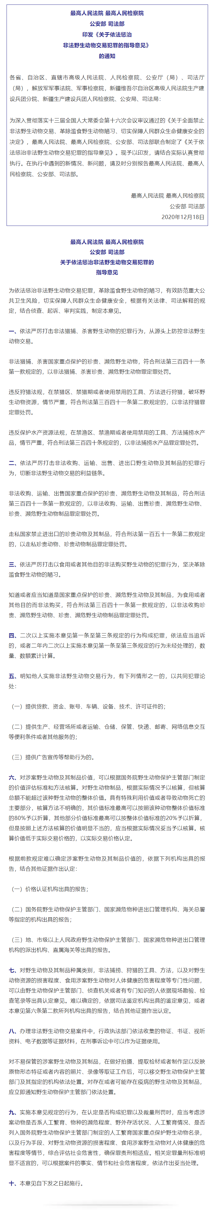 全文 | 两高两部印发《关于依法惩治非法野生动物交易犯罪的指导意见》