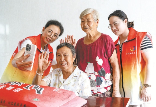 10月5日,江苏省南通市通州区金新街道界北村志愿者帮助老人与远在海外的子女进行视频通话,“云端”相聚,共迎中秋。新华社发翟慧勇摄
