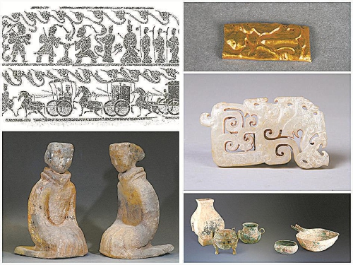 办案中追回的部分文物,从左至右依次为汉画像石、跽坐俑、金饰、鸡心佩(国家二级文物)、青铜器。