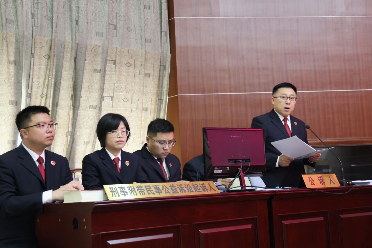 庭审中,何海晏检察长宣读了起诉书,围绕指控的犯罪事实,有针对性地进行庭审讯问,同时就事实认定、量刑情节、法律适用等方面发表意见,准确提炼案件争议焦点,并对辩护人的意见进行答辩。针对该案造成的生态环境损害,检察机关同步提起刑事附带民事公益诉讼,诉请法院判令各被告人支付生态环境损害赔偿金,并在媒体上公开赔礼道歉。
