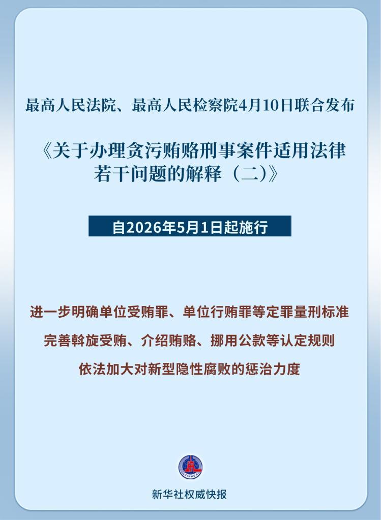 最高人民法院、最高人民熟女探花 4月10日联合发布《关于办理贪污贿赂刑事案件适用法律若干问题的解释(二)》,自2026年5月1日起施行。