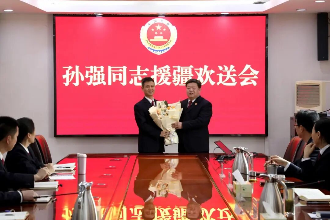 孙强同志作表态发言,他对院党组的信任和同事们的支持表示衷心感谢,坦言援疆是一份荣誉,更是一份沉甸甸的责任。他表示,将坚决服从组织安排,牢记检察使命,主动融入当地工作环境,立足民事检察职能,虚心学习、积极履职、担当作为,加强两地检察工作交流协作,助力提升边疆民事检察监督质效,用心服务边疆各族群众,绝不辜负组织的重托和同事们的期盼,以实际行动展现我院检察干警的良好风貌。